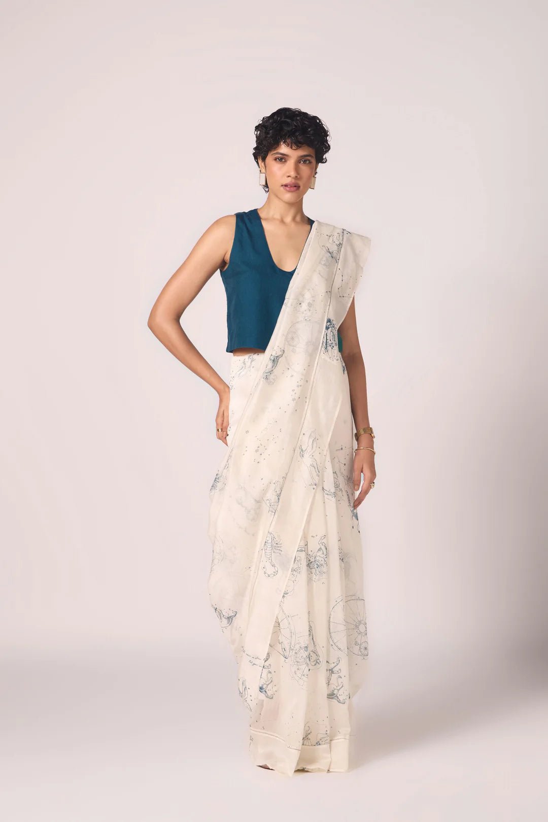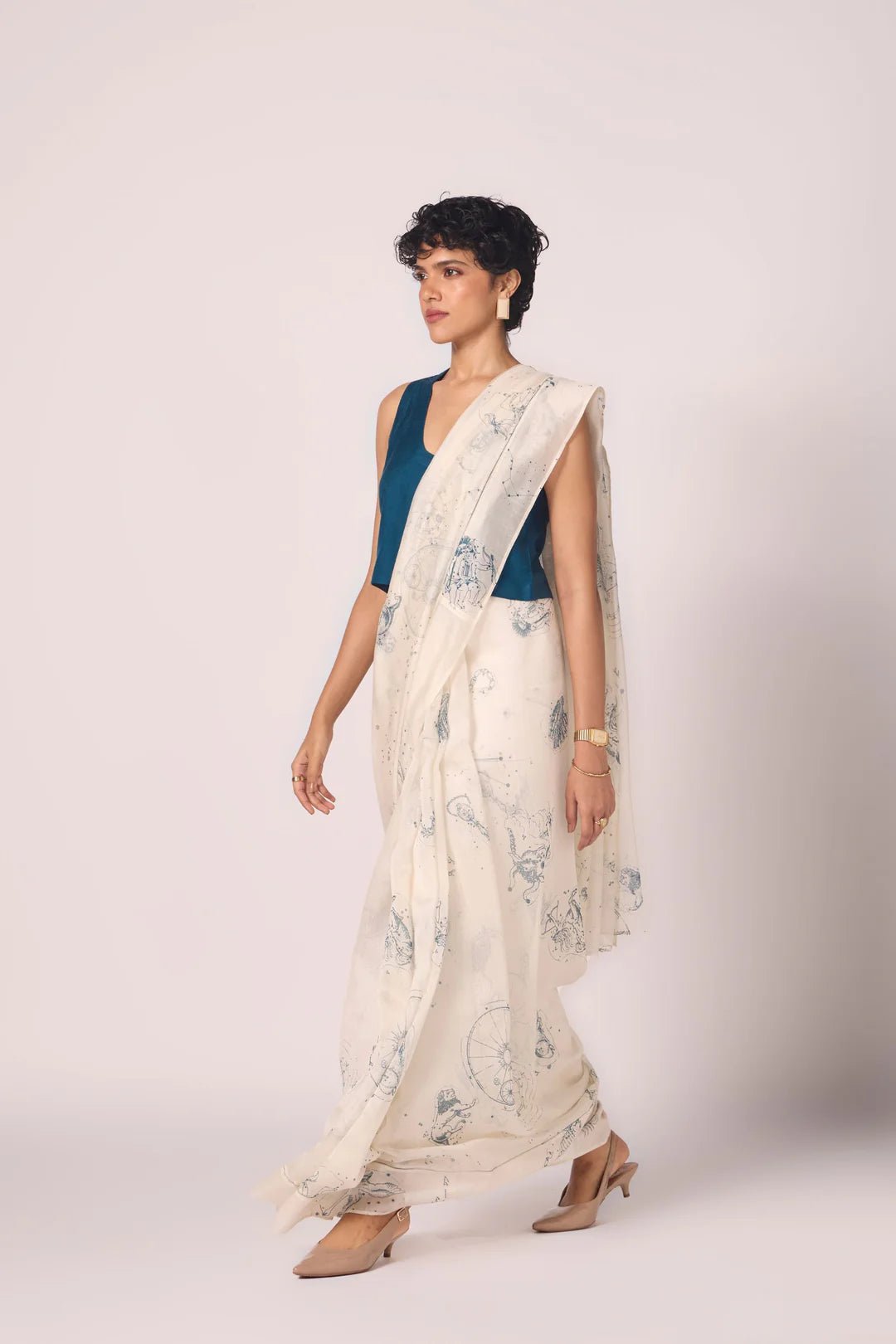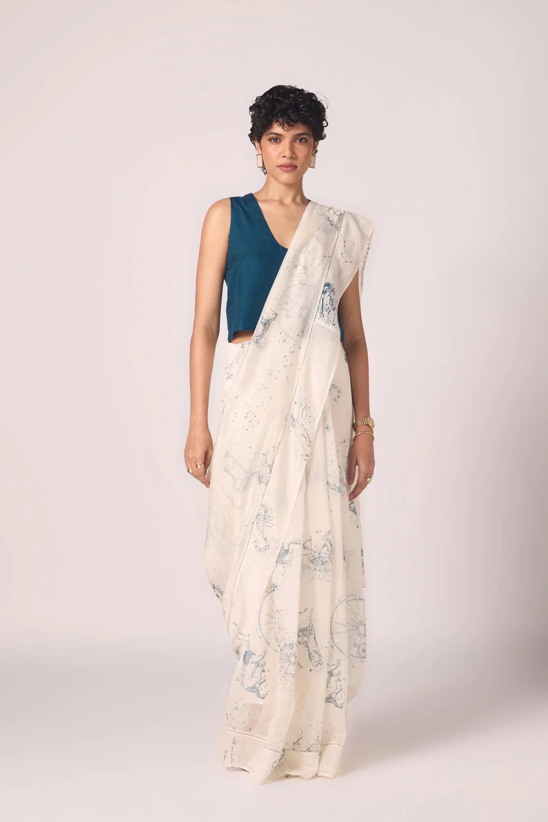 A sari that wears like starlight. Handwoven Chanderi forms a sheer canvas for constellation print, while fagotting detail along the border lends quiet intricacy. Light, fluid, and radiant — it carries six yards of poetry.