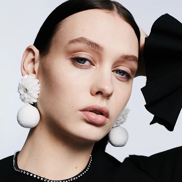 For a night out at the Opera, wear the statement Gold Flower Drops, conveying the beauty of fine crochet work with Aurum crystals forming our signature flower motif.