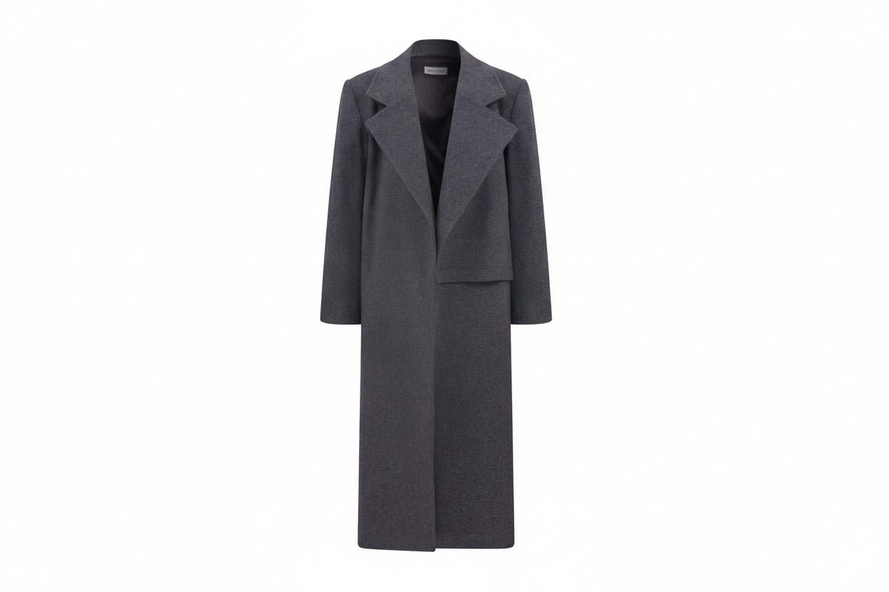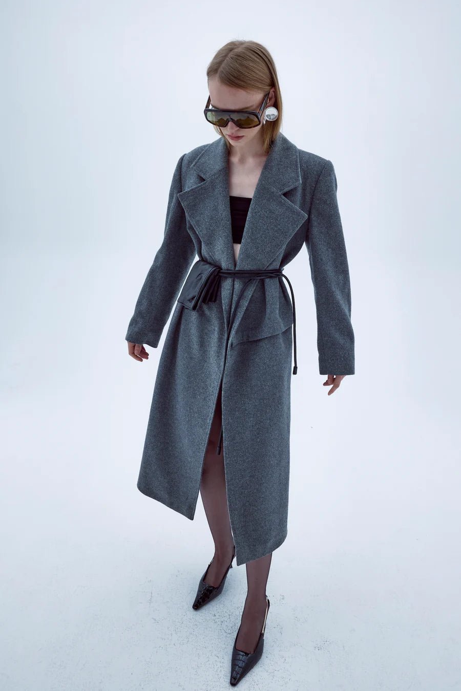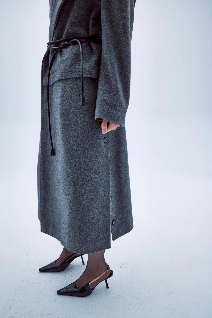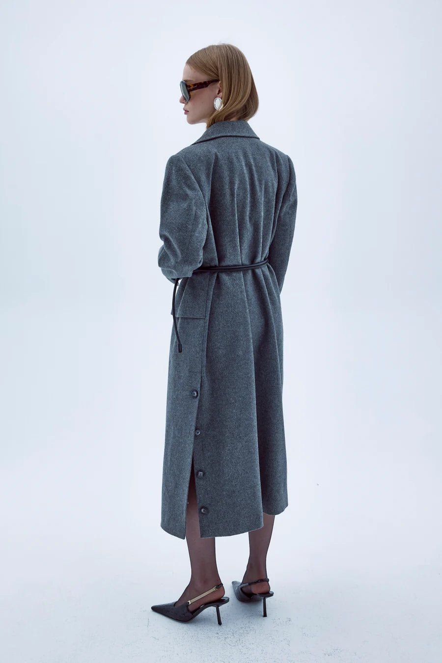 Nazlı Ceren's Isha dark grey coat is shaped to a slightly oversized silhouette with large notch lapels and dropped shoulders. It’s made from brushed wool-cashmere blend fabric with a zip on the one cuff.