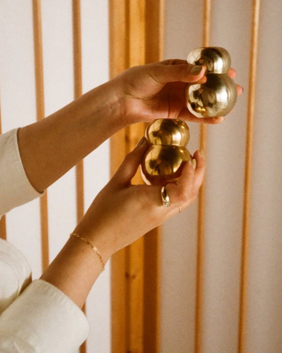 Hand-formed in bronze, the ANJOU Candleholder stacks two bubbly globes to evoke the charming silhouette of its sweet namesake pear.