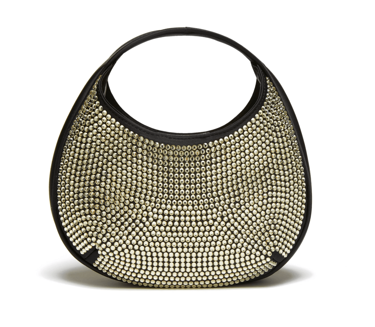 Our contemporary take on hobo bags, the 'Mila' is a mini top handle bag with a softly rounded shape. Made in Italy, this variant is crafted from black satin embellished with shimmering crystals in jonquil-tone, making it perfect for evening events and parties. It features a magnetic tab fastening along the top.