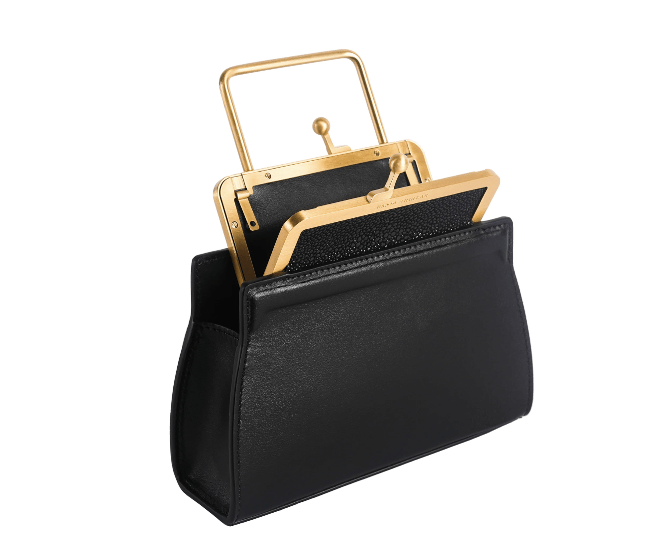 Named after the founder's sister, the ‘Mini Dana’ is a modern interpretation of the classic frame bag, with a twist. This clasp bag features a custom brass frame with a fixed top handle, and a filled leather frame. The double-frame design is intended to create a visual illusion of 'one bag inside another'.