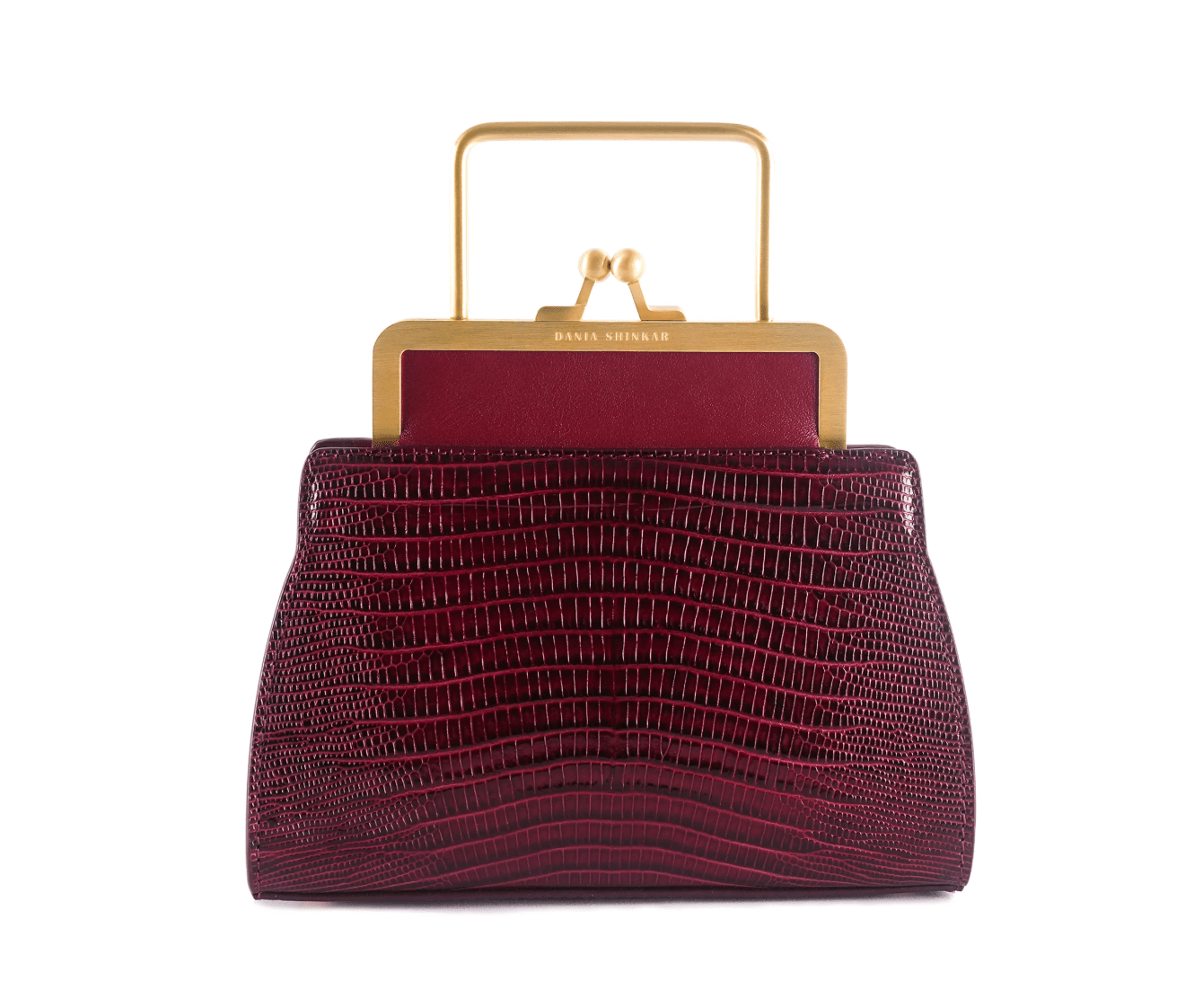 Engraved with the DANIA SHINKAR logo, this variant is made in Italy from burgundy lizard-embossed vegetable tanned cowhide leather and cherry red nappa. Hardware in light gold-tone.