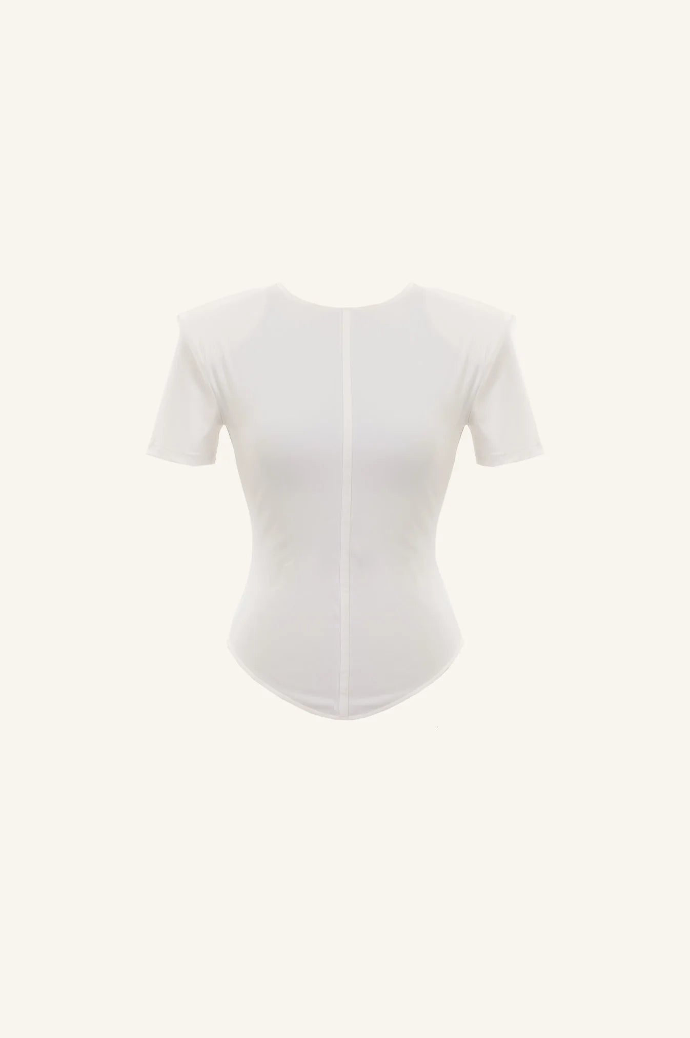 Sleek and structured, white fitted top with defined padded shoulders and contouring seams that enhance the silhouette.