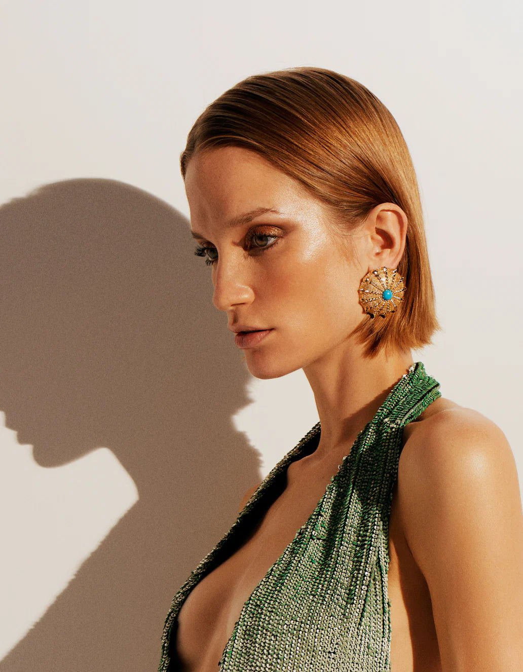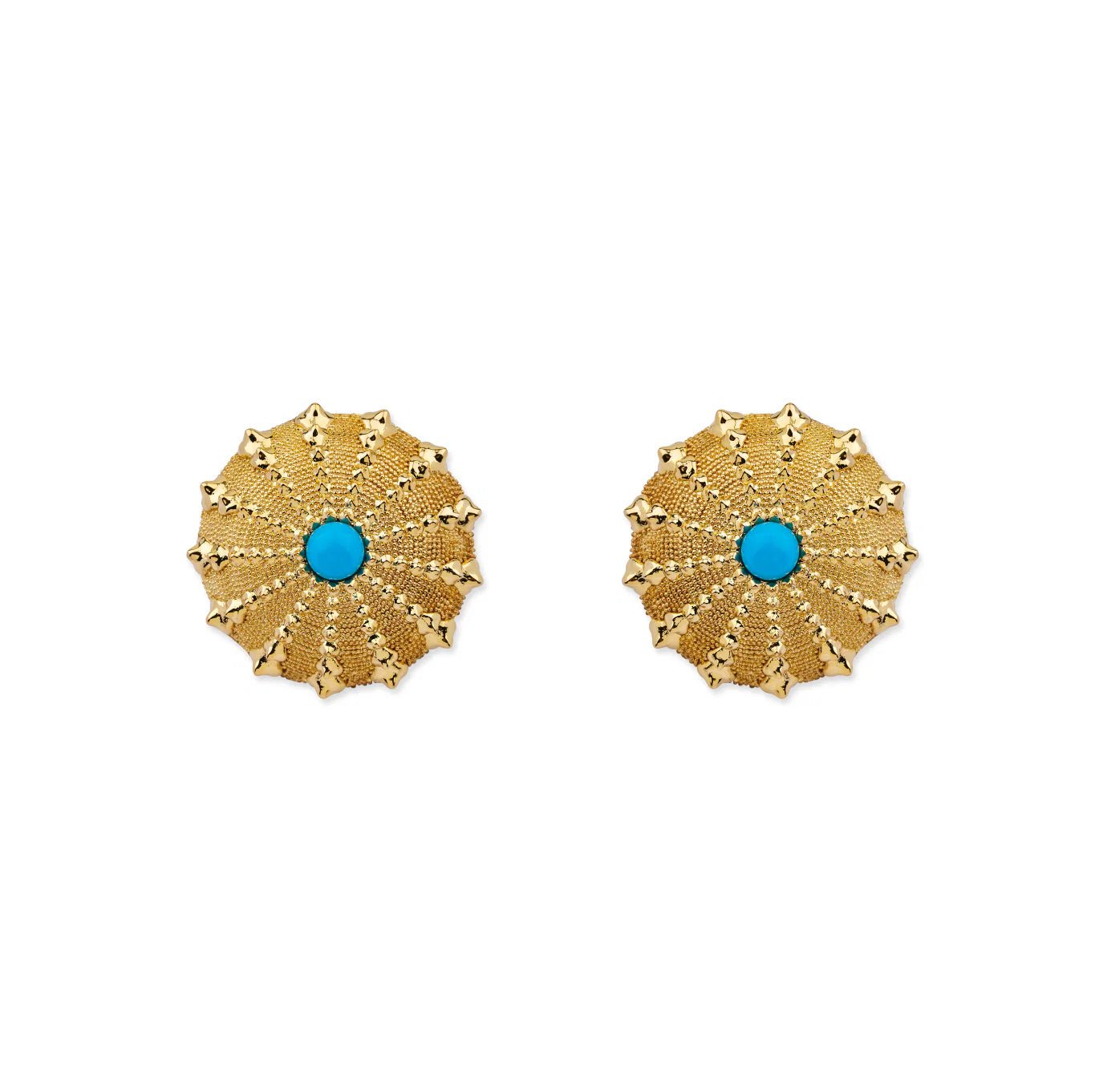 Elegant turquoise earrings inspired by the Greek island of Patmos. Each piece measures 4 × 4 cm and weighs 26 grams, crafted from nickel-free 22K gold-plated bronze for sensitive skin. Secured with post and clasp fastenings designed for pierced ears. Handcrafted with care in Istanbul, these statement earrings blend Mediterranean beauty with artisanal craftsmanship.