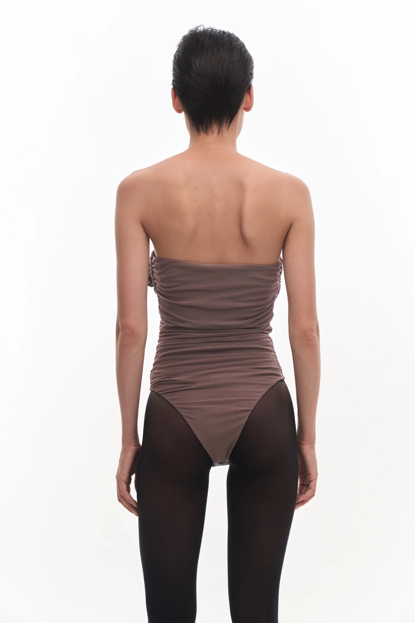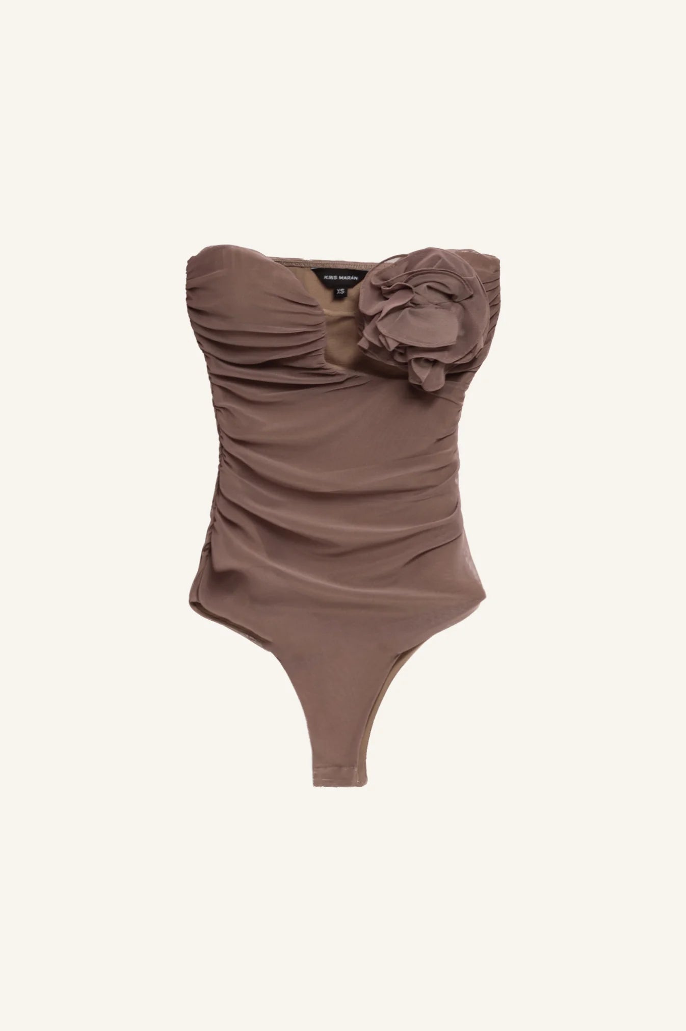 Draped bustier bodysuit with assymetrical front cut and a flower. Lining. Side hidden zip fastening.