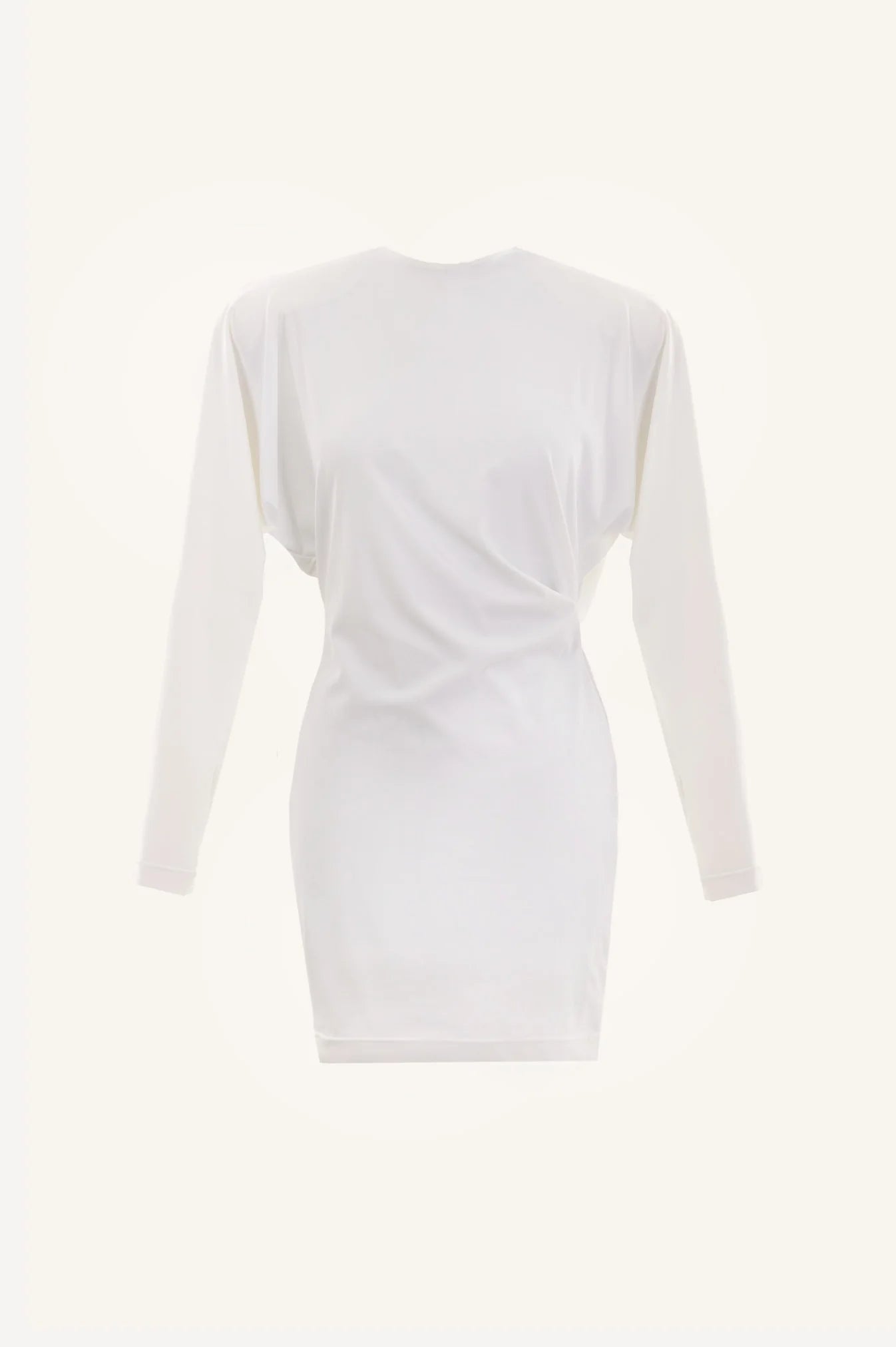 Draped dress in ultra-stretchy fabric with back collar and sculptured shoulders.