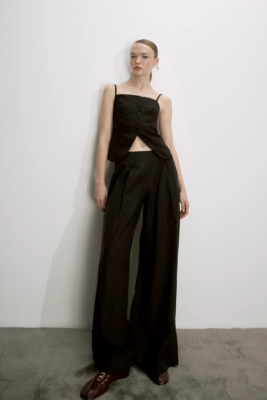 Tailored to an exaggerated wide leg frame, Nazlı Ceren's Mui trousers are generously cut from linen fabric with a touch of softness, balanced with a mid-rise waist.
