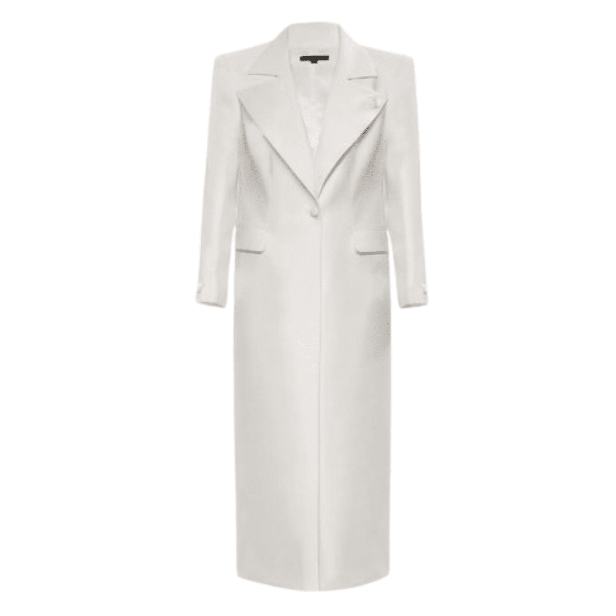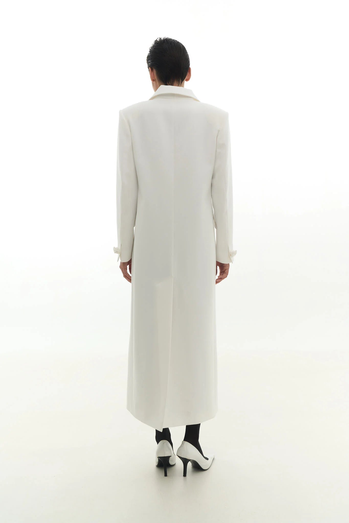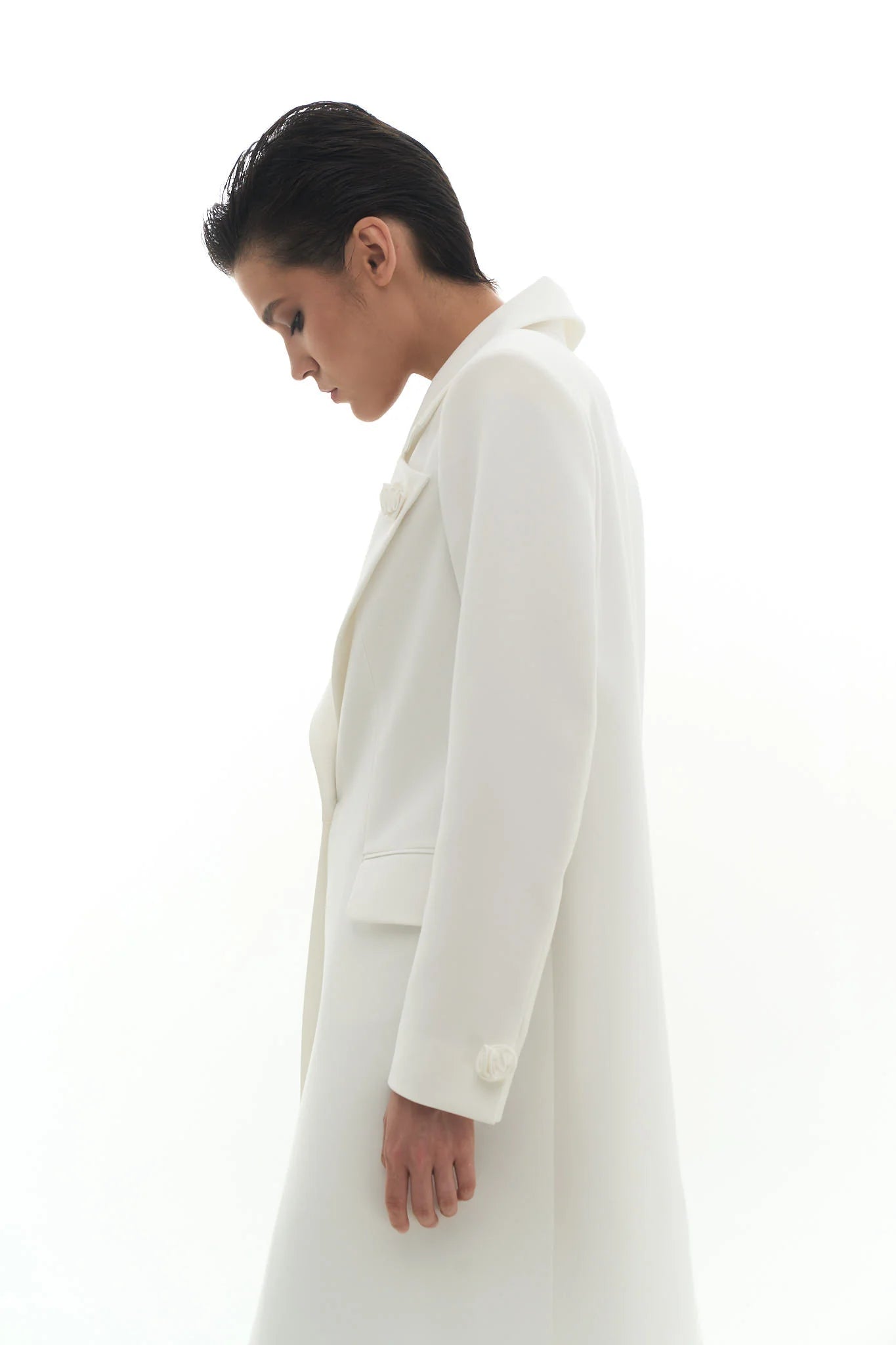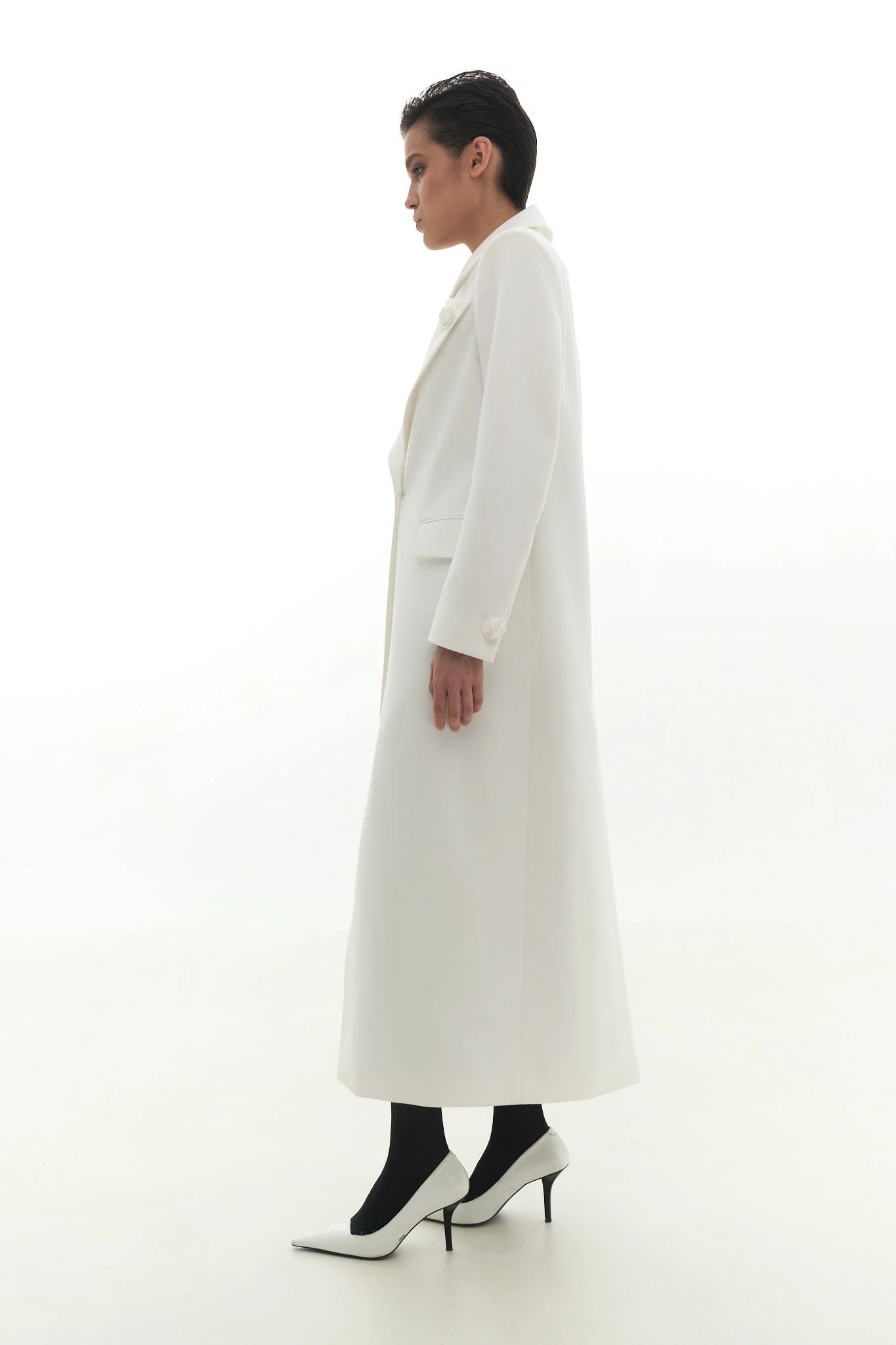 Straight cut maxi coat with wide shoulders. Decorated with rose appliqués on a collar and sleeves. Single-button fastening. Lining. Back vent.