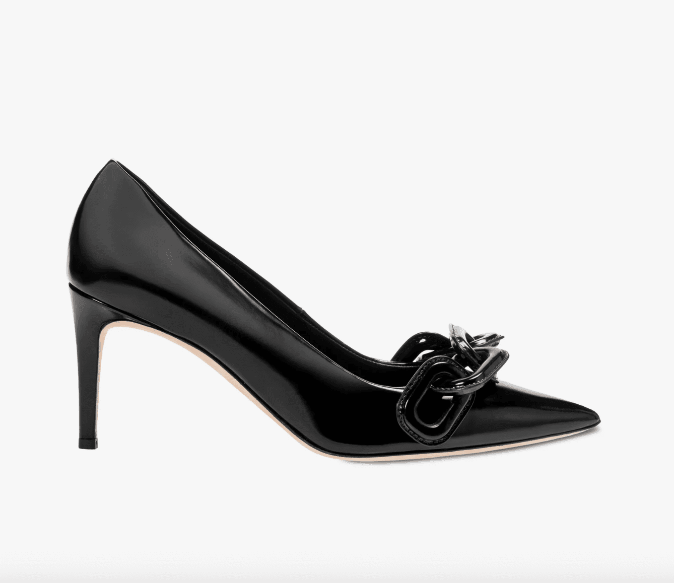 Handcrafted in Italy from patent black leather with luxuriously lined in patent leather chains, the Catena Pumps feature a sleek pointed toe set on a slim 70mm stiletto heel. A result of Impeccable craftsmanship and timeless design, the pumps are detailed with a brand new iteration of Serena Uziyel’s signature Catena chain links, this time delicately wrapped in threads of sumptuous suede. Classic and easy to style, the pumps are ideal to pair with anything from tailoring to midi dresses.