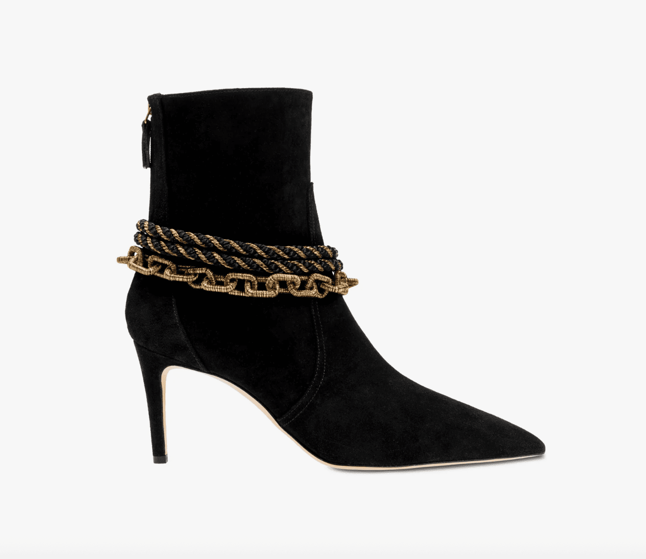 Serena Uziyel’s take on the ankle boot combines Italian craftsmanship with bold, modern edge. Available in black and brown suede, the style is defined by elongated pointed toes set slightly beneath the shoe for a distinctive silhouette. Around the ankle, ornate anklets of signature embroidery, chain links, and metallic-thread braids introduce a bohemian spirit, turning a western classic into a statement of timeless elegance.