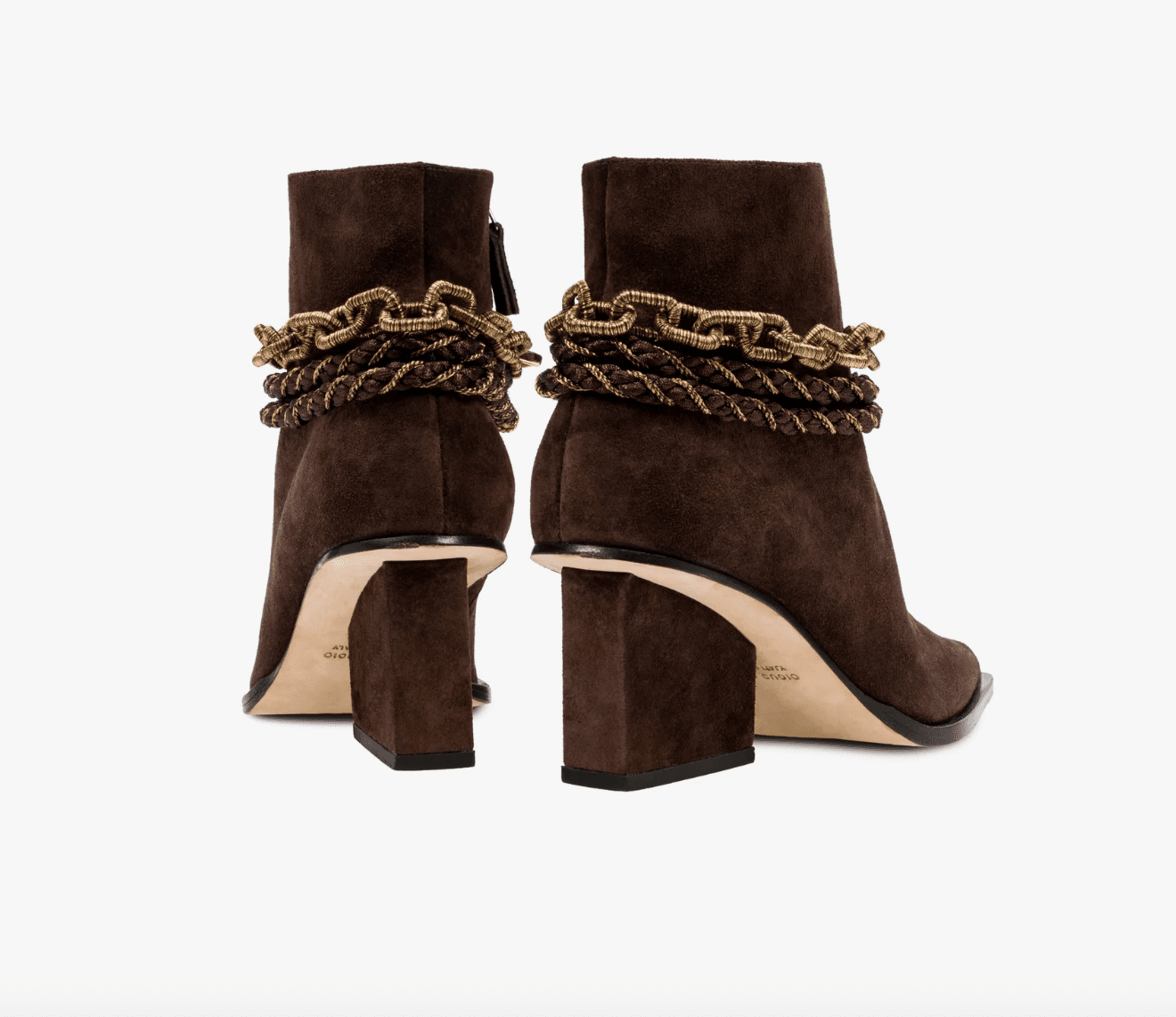 Serena Uziyel’s take on the ankle boot combines Italian craftsmanship with bold, modern edge. Available in black and brown suede, the style is defined by elongated pointed toes set slightly beneath the shoe for a distinctive silhouette. Around the ankle, ornate anklets of signature embroidery, chain links, and metallic-thread braids introduce a bohemian spirit, turning a western classic into a statement of timeless elegance.