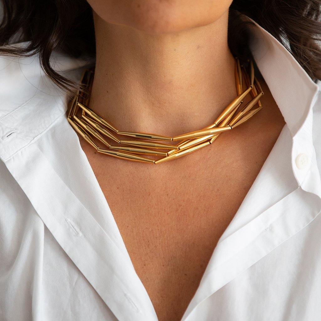 24 ct gold plated brass short necklace with rayons of sunshine tubes. 4 lines folded together. Our products are nickel and lead free. Our designs are fully handcrafted by experienced local artisans in our Istanbul Ateliers. Made using traditional craft techniques.Please give this piece 2-3 weeks to ship.