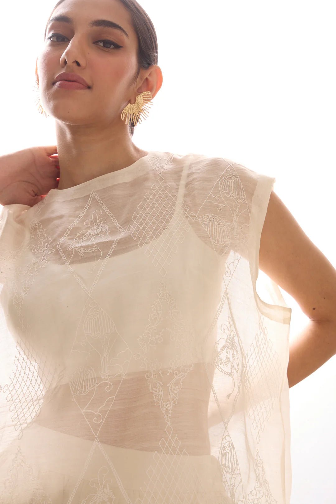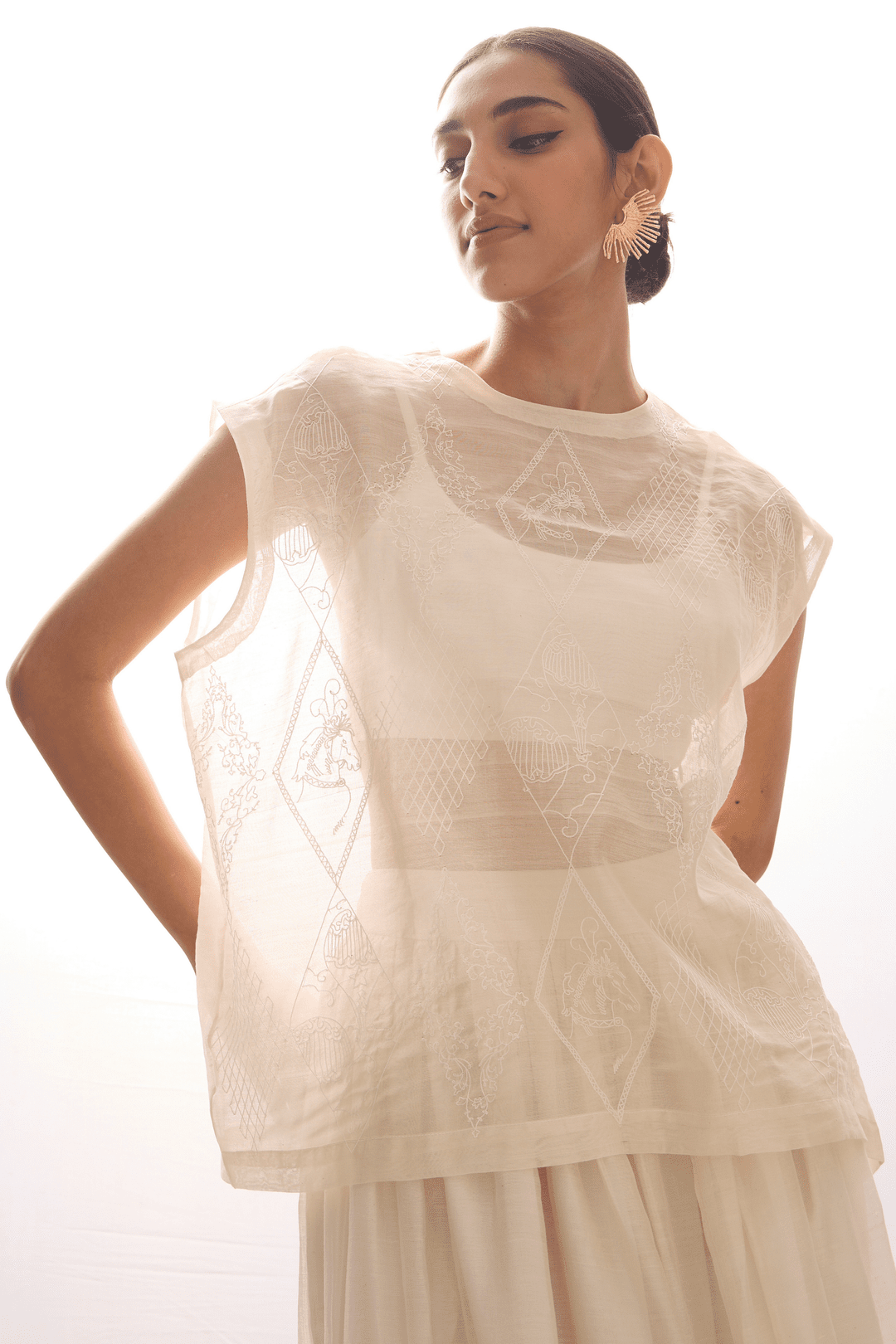 A box-fit top in handwoven Chanderi with hand embroidered front panel. Drop shoulders sleeves. Features a single Rouleau button in the back.