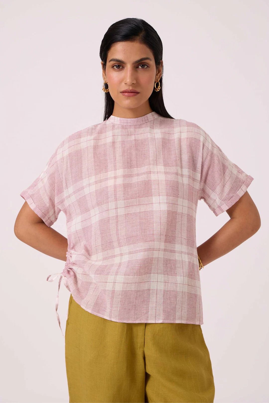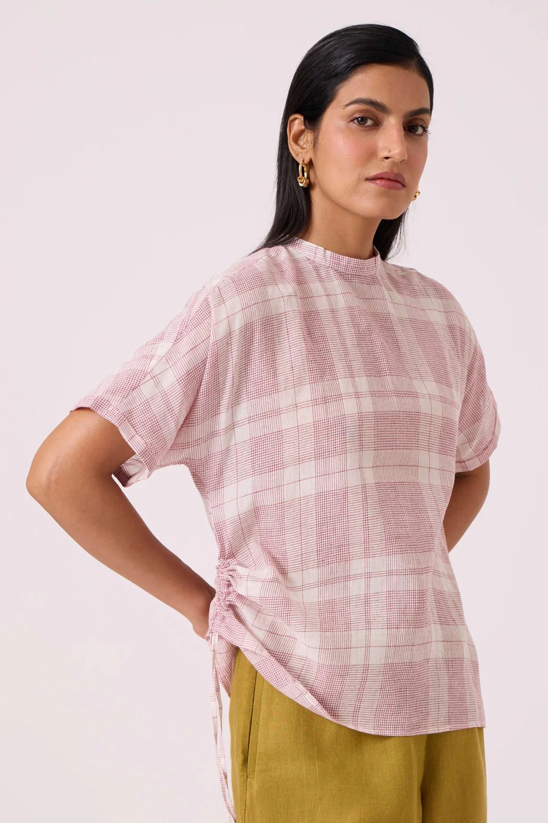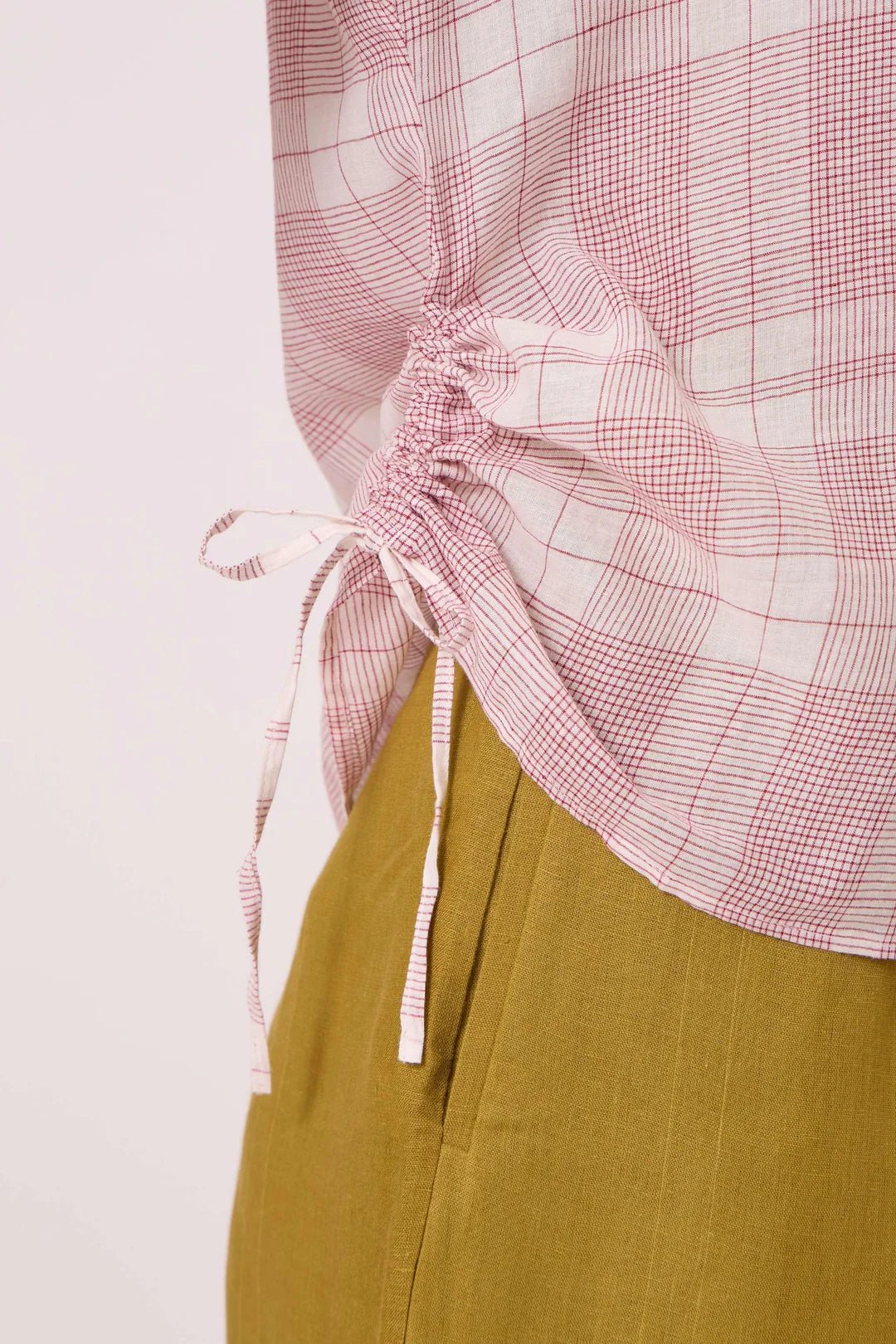 - Side ruching with adjustable drawstring
