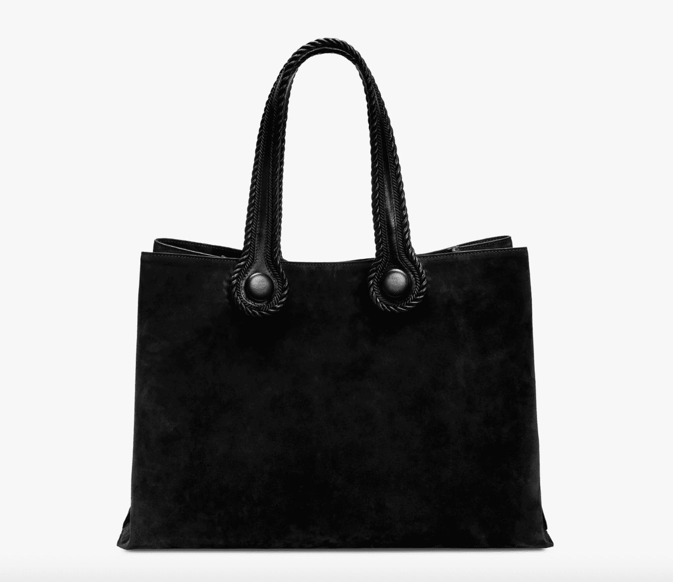 An oversized carry-all with a sleek, understated body and statement detailing, crafted in Italy from velvety midnight-black suede. Its structured, boxy silhouette is generously sized—fit for a laptop, layers, and travel essentials—making it as practical for the daily commute as it is for a long-haul flight. Wide, sculptural leather handles, subtly trimmed with woven leather, sit comfortably on the shoulder and add depth and distinction. Minimal yet striking, it embodies the Serena Uziyel aesthetic—equally at ease in the city or on a weekend escape.