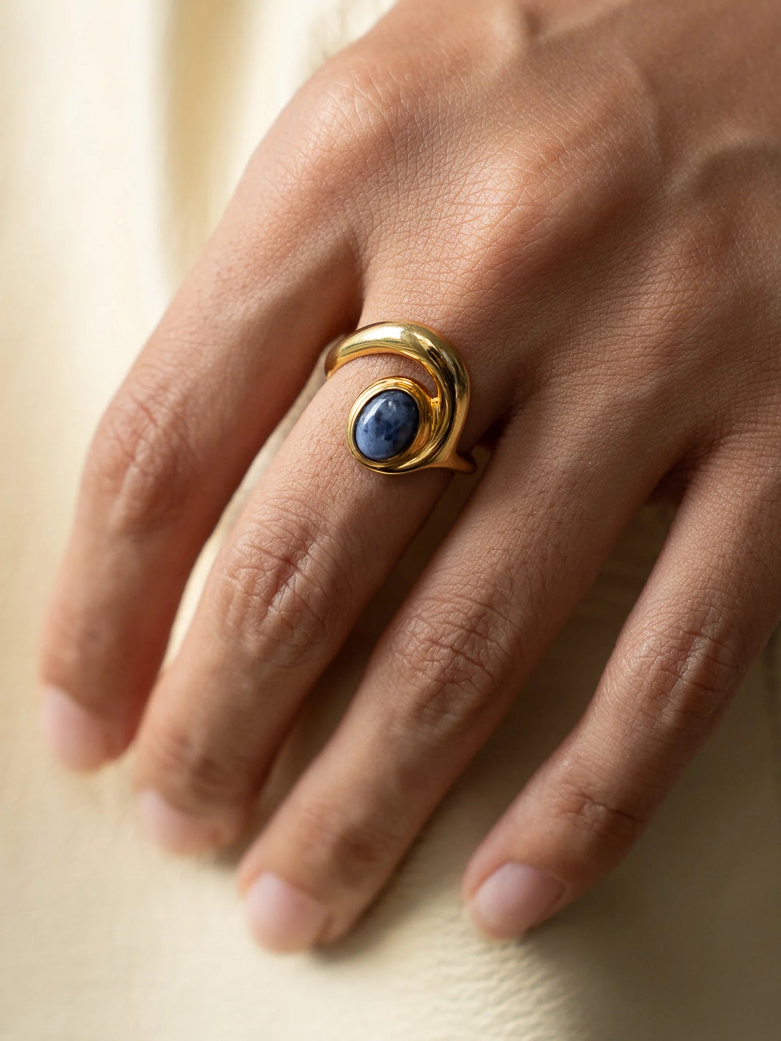 It is twisted around the finger and has a beautiful lazurite stone in the middle. Made to be worn as a standalone piece or in combination with other jewelry.