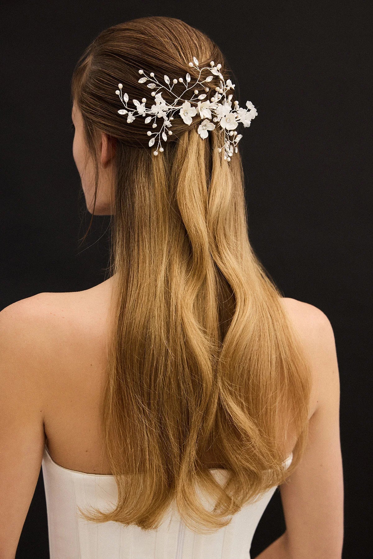 Elevate your bridal look with this exquisite seven-piece hair pin set, featuring delicate flowers crafted from premium fabric and porcelain. Each pin is designed to add romantic elegance to your wedding day style, whether worn individually or clustered for dramatic impact. Perfect for securing updos, adding dimension to loose waves, or creating a cohesive bridal aesthetic.