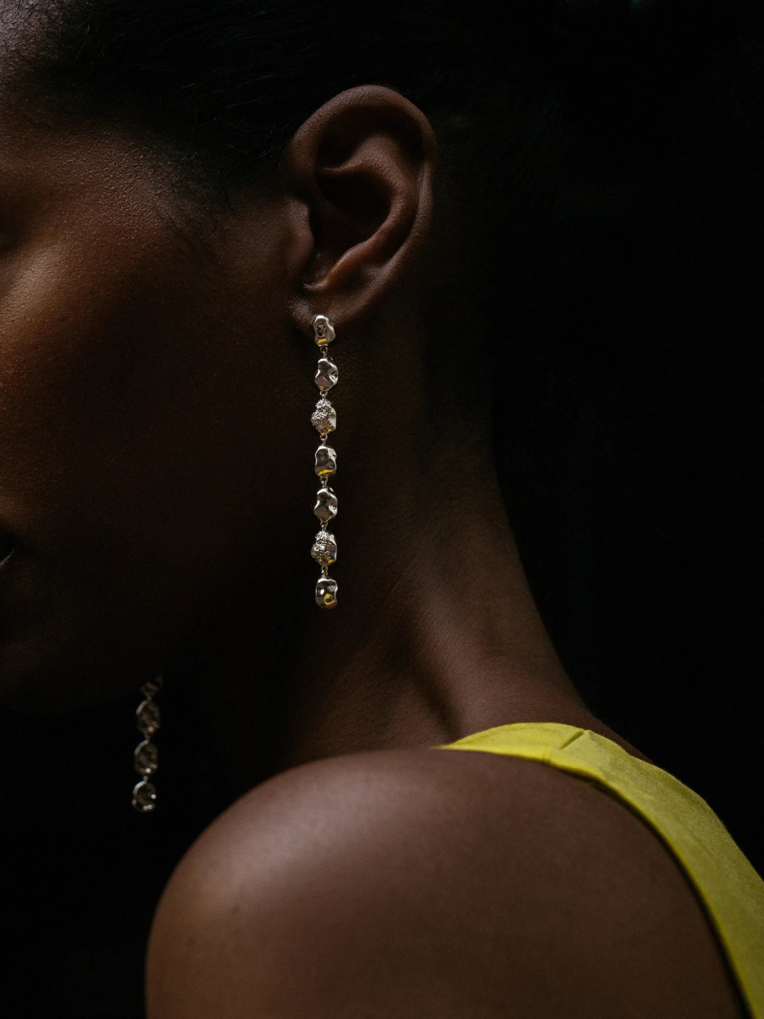 Meet our new Eva long earrings, designed with bold asymmetry for a modern, statement-making look. One earring features a 7 cm link fully covered in crystals, while the other pairs a 5 cm mix of metal and crystal links for a unique twist.
