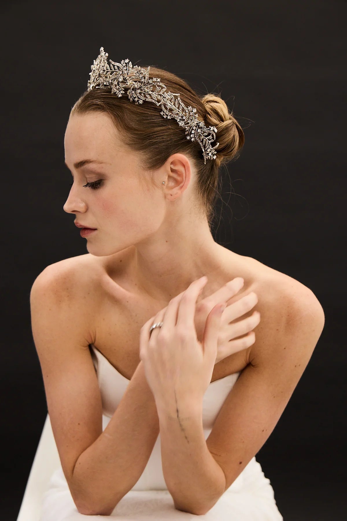 The ISABELLA Headband is an elegant bridal accessory featuring antique silver-plated brass adorned with sparkling crystal stones. Perfect for weddings, engagements, or special occasions, this timeless piece adds sophisticated glamour to any bridal look. The vintage-inspired design complements both classic and modern wedding styles.