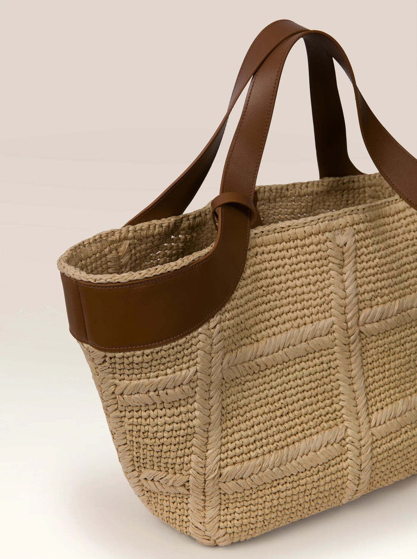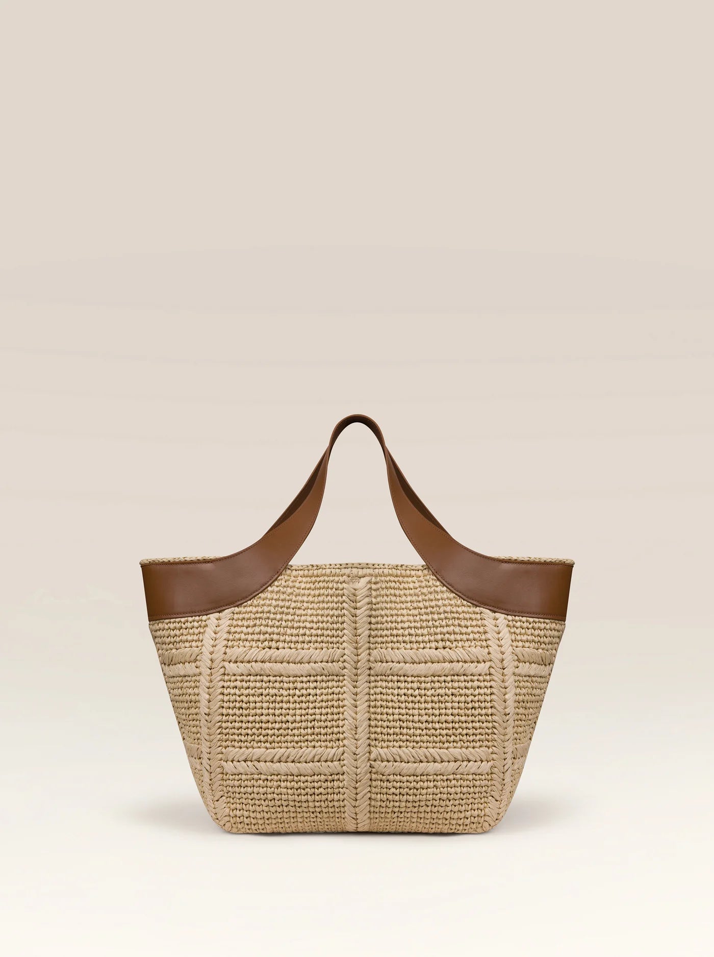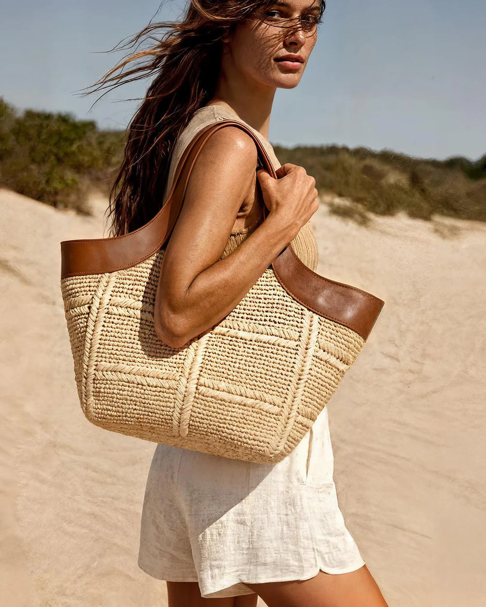 The Mare Beige is a luxurious beach tote crafted from handwoven raffia with refined leather accents. This versatile bag features a wipeable surface perfect for seaside adventures, while the included removable mini leather clutch adds practical elegance for essentials.