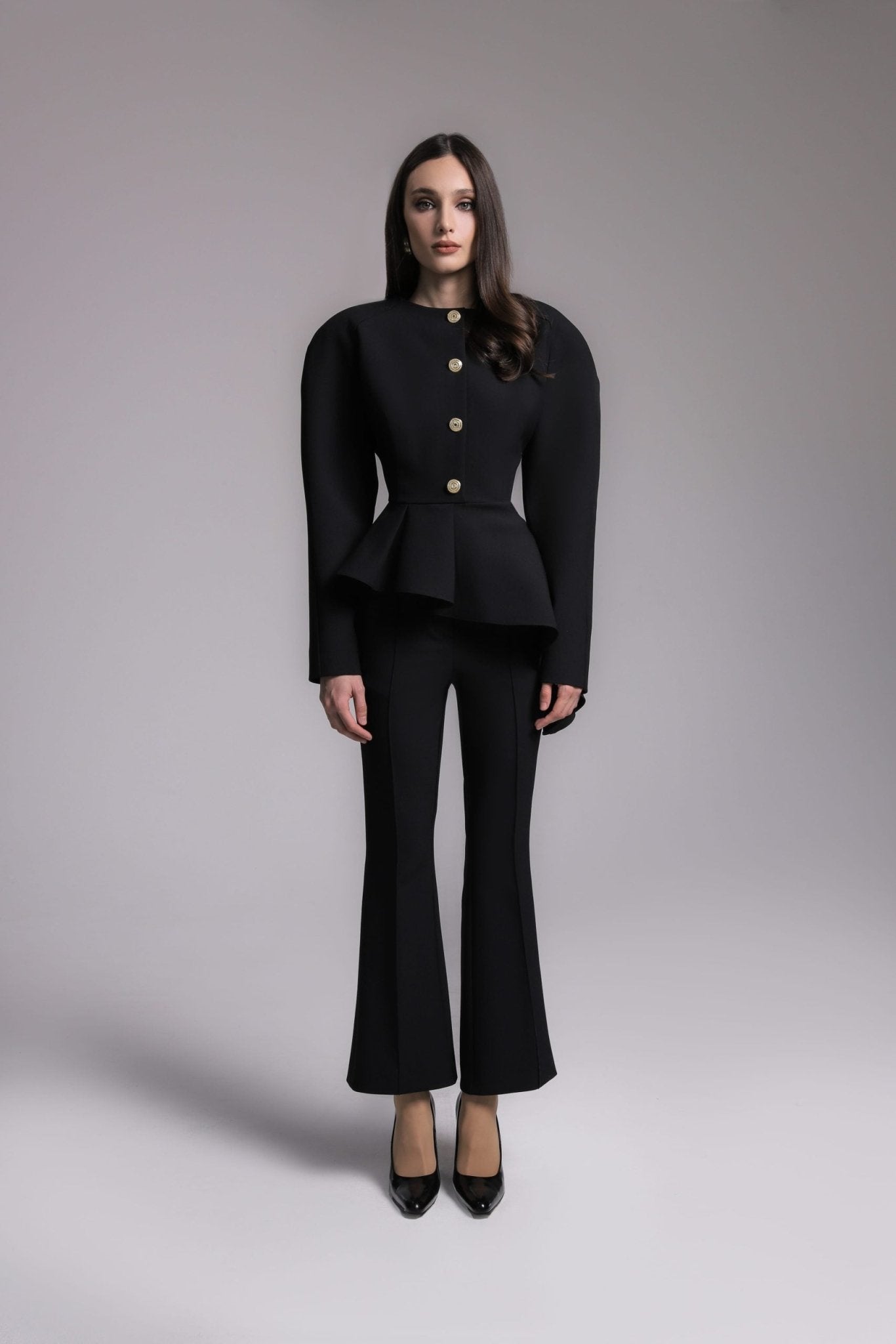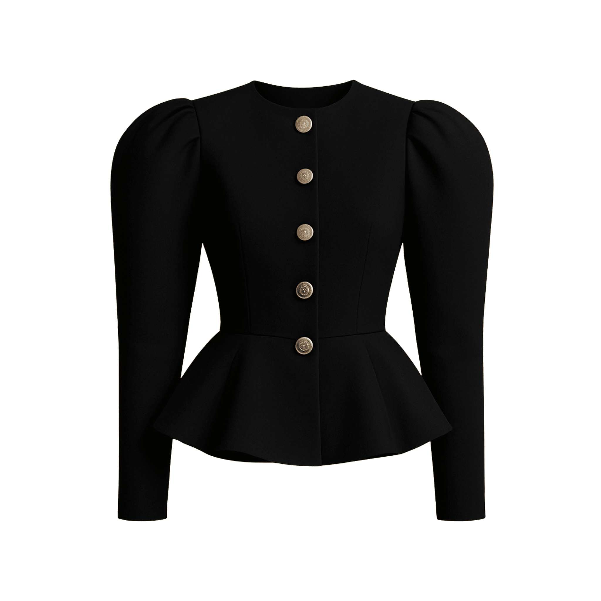 This exquisite black top is the ultimate statement in modern elegance: dramatic puffed sleeves, a sculpted peplum waist, and gleaming gold buttons. The sharp collar and precise tailoring create an hourglass silhouette that feels powerful, feminine, and impossibly flattering – the kind of piece that instantly elevates any look to iconic status.