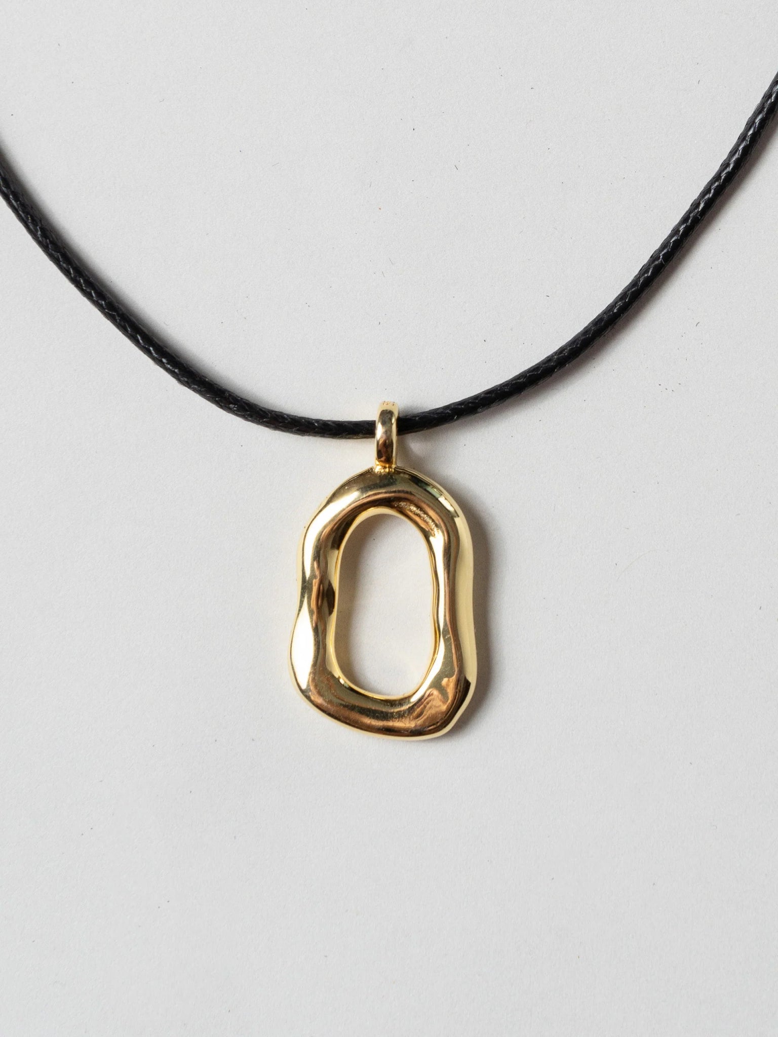Our new ISA necklace features a 2.5 cm gold-plated silver pendant with an irregular shape. It’s strung on a glossy leather cord with silver tips and can be adjusted to different lengths. The necklace’s maximum length is 60 cm.