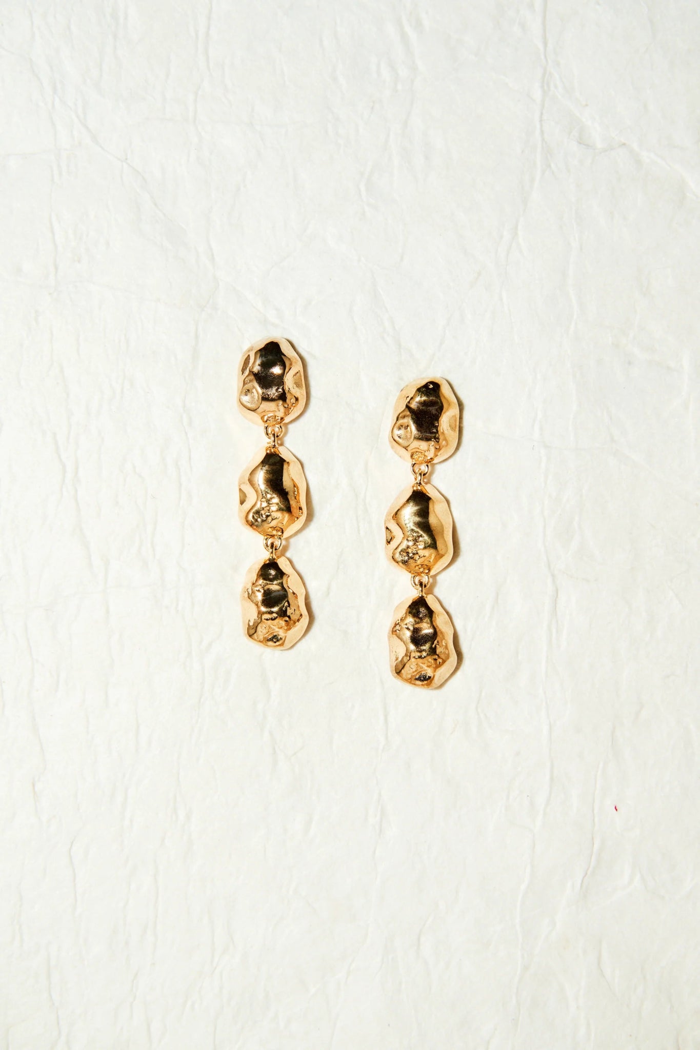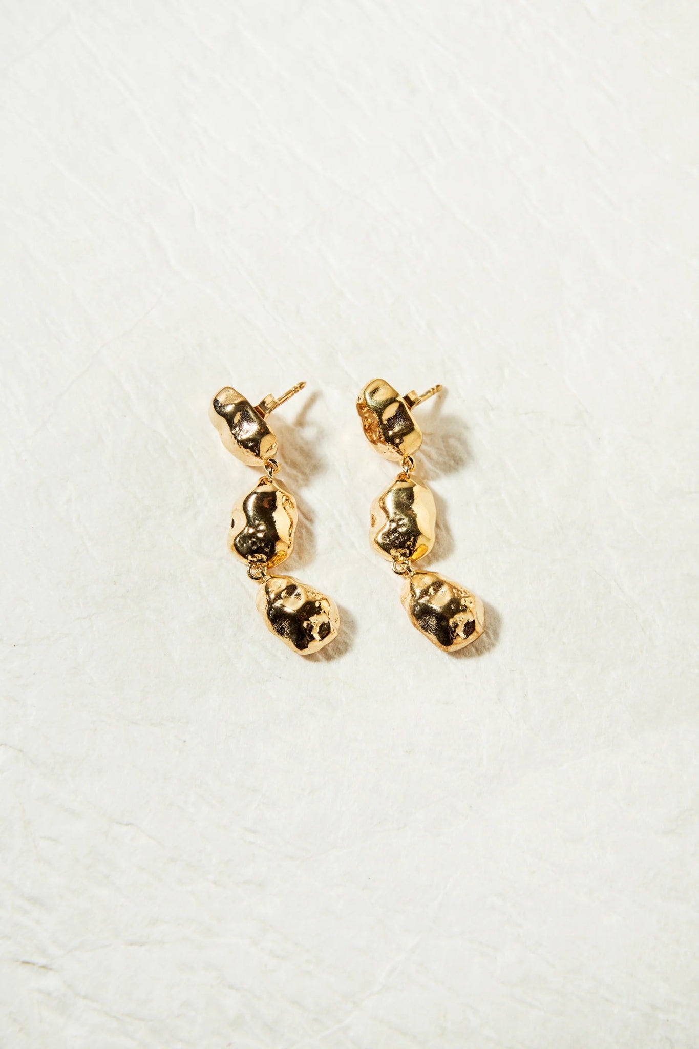 The Eva earrings are handcrafted from gold-plated silver with a textured, matte finish. They feature a unique design composed of three distinct parts, each with its own shape. The earrings are 4 cm in length and weigh 12 grams, offering a bold yet elegant statement. Designed in Amsterdam, they combine artisanal craftsmanship with modern style.